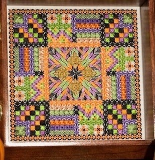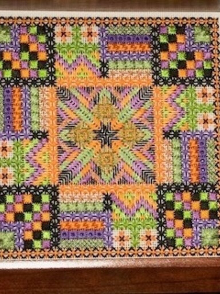 Counted thread design size is 6 inches square stitched on 18 count canvas.