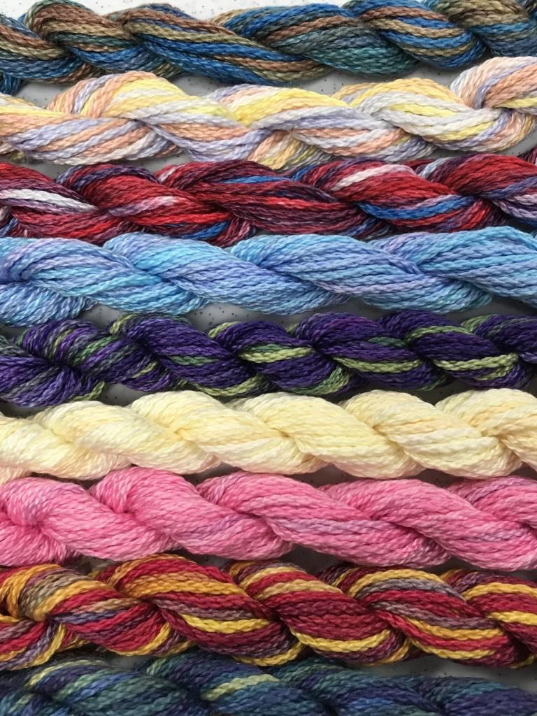 Create an accountA three-ply hand-dyed pima cotton in variegated colors. It has a silky sheen, especially when used with long, flat stitches. Separate the plies and use one or more in the needle according to the pattern directions. One ply is about the same weight as a #5 pearl cotton or six plies of cotton floss or one ply of persian wool. Also good for Sashiko.